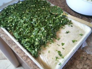 My mom’s side of the family is Greek, and growing up, we lived in the same town as my grandparents.  And no, not next door like in My Big Fat Greek Wedding.  We did get to see them often, though, and I did get a chance to learn some Greek traditions, attend some services at the Greek Orthodox church, and learn how to cook some traditional Greek dishes.  This also means that most of the dishes I learned how to make, I make from memory or sight, add a handful of this, a little of this, a little of that, until it looks right.  However, I have measured out the way I make spanakopita to my taste, and when I got all the spinach from Bountiful Baskets over the last 2 weeks, I knew I wanted to make this to be able to share how I make it since I get asked a lot.  So, here we go!