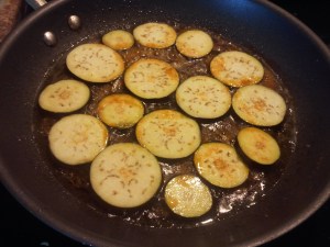 2. Heat a large non-stick skillet and add the vegetable oil, sesame oil, soy sauce, mirin, sugar and ginger.  Place the eggplant slices in the skillet and cook the eggplant slices on both sides until tender.