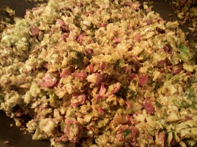 The last time I got Brussels sprouts from Bountiful Baskets, I had to figure out how to cook them. I’m not a big fan of them just steamed, so I came across this recipe. It’s not the healthiest way to eat these, but it’s definitely tasty. I do use turkey bacon for the bacon, just because we prefer turkey bacon. With turkey bacon, you won’t have the grease to set aside like with regular bacon, but it’s ok, there is still plenty of butter. The original recipe also calls for pine nuts, but I didn’t used them and I don’t think it’s missing them.