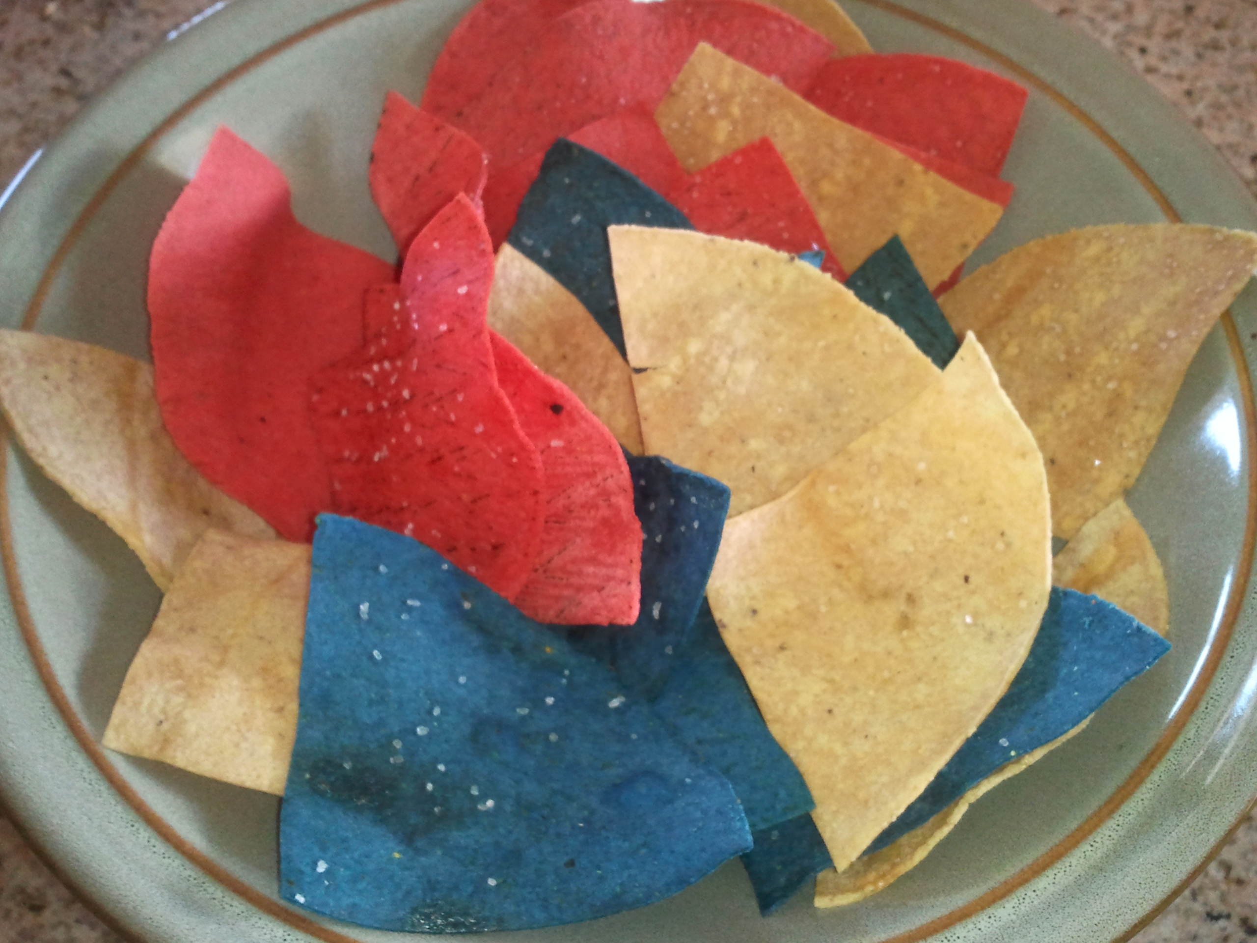 One of the extras this week from Bountiful Baskets was a bag of pre-cut, ready to bake tortilla chips. Since I knew that I definitely wanted to get the guacamole veggie pack that was also an extra, I was going to need some chips to go with it. I have gotten this as an extra before, as well as the tortillas that have been offered, all of which I have been happy with. And I was very happy with these, very pretty colors, perfect to go with the teams in the Super Bowl today. These chips were very easy to make, and you could make them with any corn tortillas. Just cut the tortilla to the size chips that you want. Then, lightly spray a baking sheet with oil, lay out the chips in a single layer, lightly spray the tops with oil, then sprinkle with some salt (I use sea salt, but salt can be omitted). Bake in a preheated oven at 350 F. Start checking them at 5 minutes, and bake until you get your desired crispness. I cooked 2 baking sheets full at a time, 18 chips on each baking sheet. Mine took about 15 minutes to fully cook, but my oven takes longer to cook most things.
