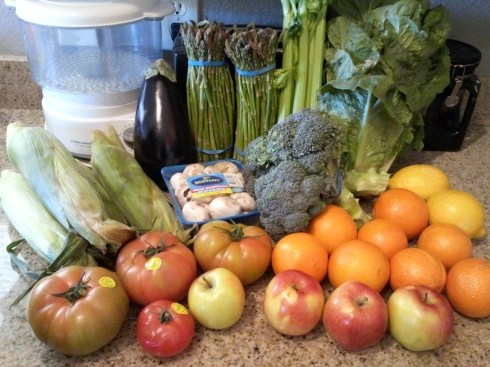 Corn, tomatoes, eggplant, mushrooms, asparagus, celery, broccoli, Romaine lettuce, lemons, oranges, and apples. Not pictured are bananas, not sure why I didn’t get them in the picture. Also, not pictured is my pineapple, I traded that for the 2nd asparagus shown. Oh, and there are 2 apples missing that got eaten by 2 little monsters.