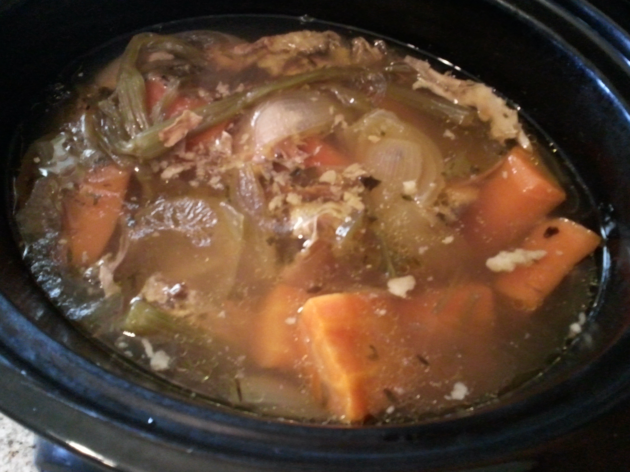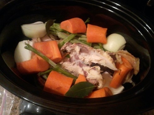 Last night, I made Kotopoulo Lemonato, and when we had finished, I just couldn’t throw out the chicken bones. I had started a scraps bag of carrots, celery, and onion in the freezer to make broth some day, plus I have plenty of celery, carrots, and onion on hand. So, I decided it was time to try to make chicken broth. I was going to do the stove top, but decided to try out the slow cooker instead. I have a 5.5 quart slow cooker, so it was a nice big size to get everything in.