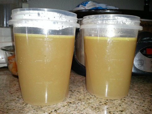 This yielded 6 cups of broth for me. I divided into 3 cups each. Most soup recipes I have call for 1 quart of chicken broth, so I will just add a cup of water to this and use it as a base for those soups. I made Avgolemono Soup (recipe coming!) with 3 cups of it tonight, and I will use the other 3 cups for Broccoli Cheddar Cheese Soup in a few days.