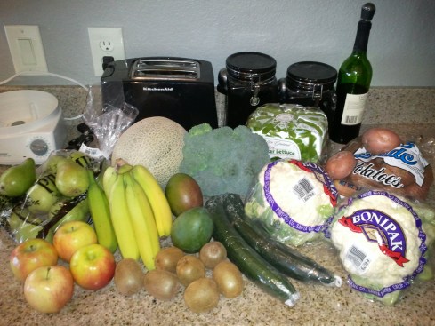 Starting at left, Anjou pears, Pink Lady apples, bananas, cantaloupe, mangoes, kiwi, broccoli, cucumbers, butter lettuce, cauliflower, and red potatoes.