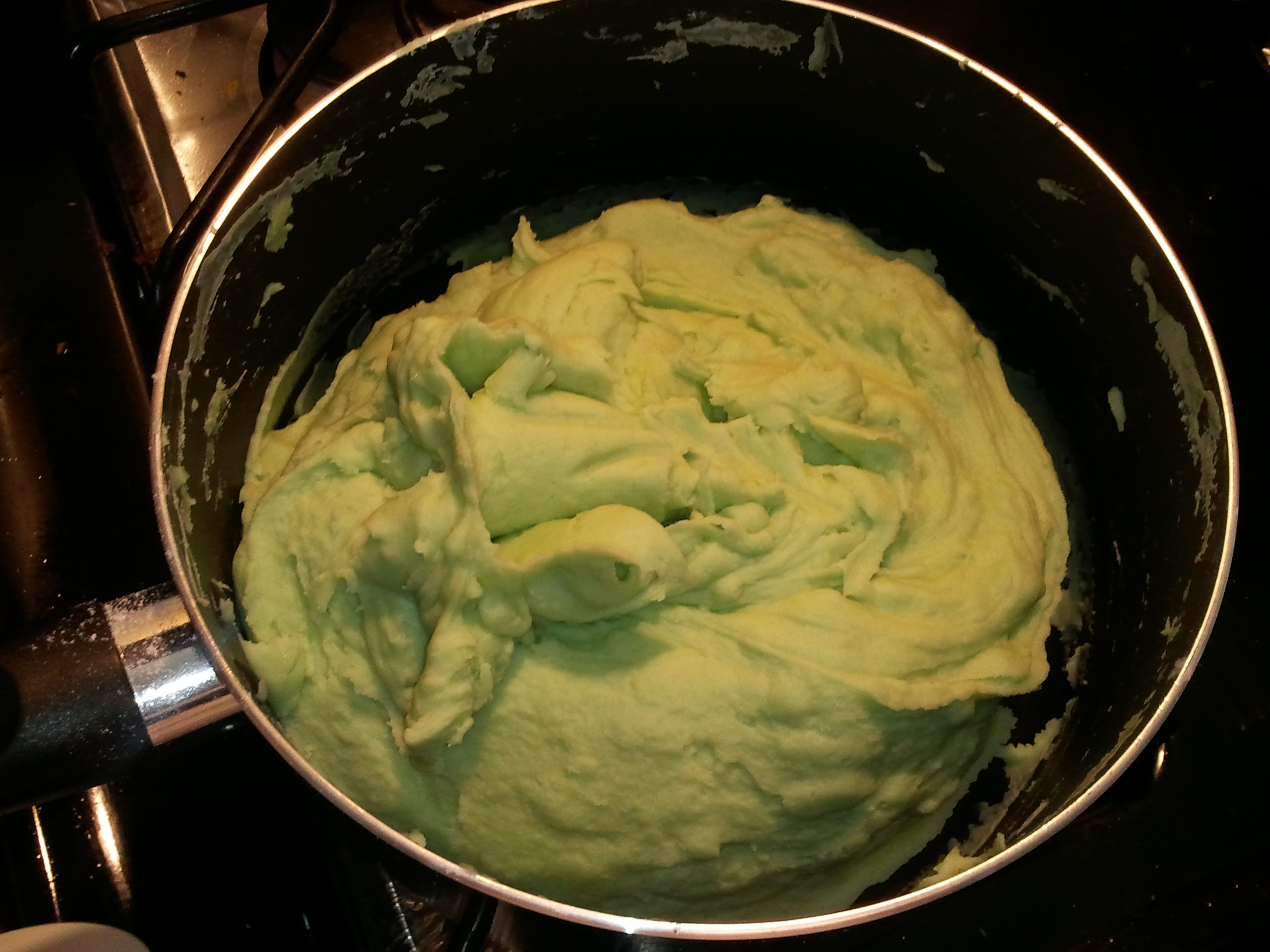 Since K wanted to help me make it, we decided it would be best to make the “popcorn” be rectangles, because she’s “not very good at cutting circles, but is very good at cutting rectangles.” So, I measured out the posterboard into 2″ x 4″ rectangles. Since it was 22″ x 28″, I got 77 rectangles total. I cut the first 7, then K went to work on the rest.