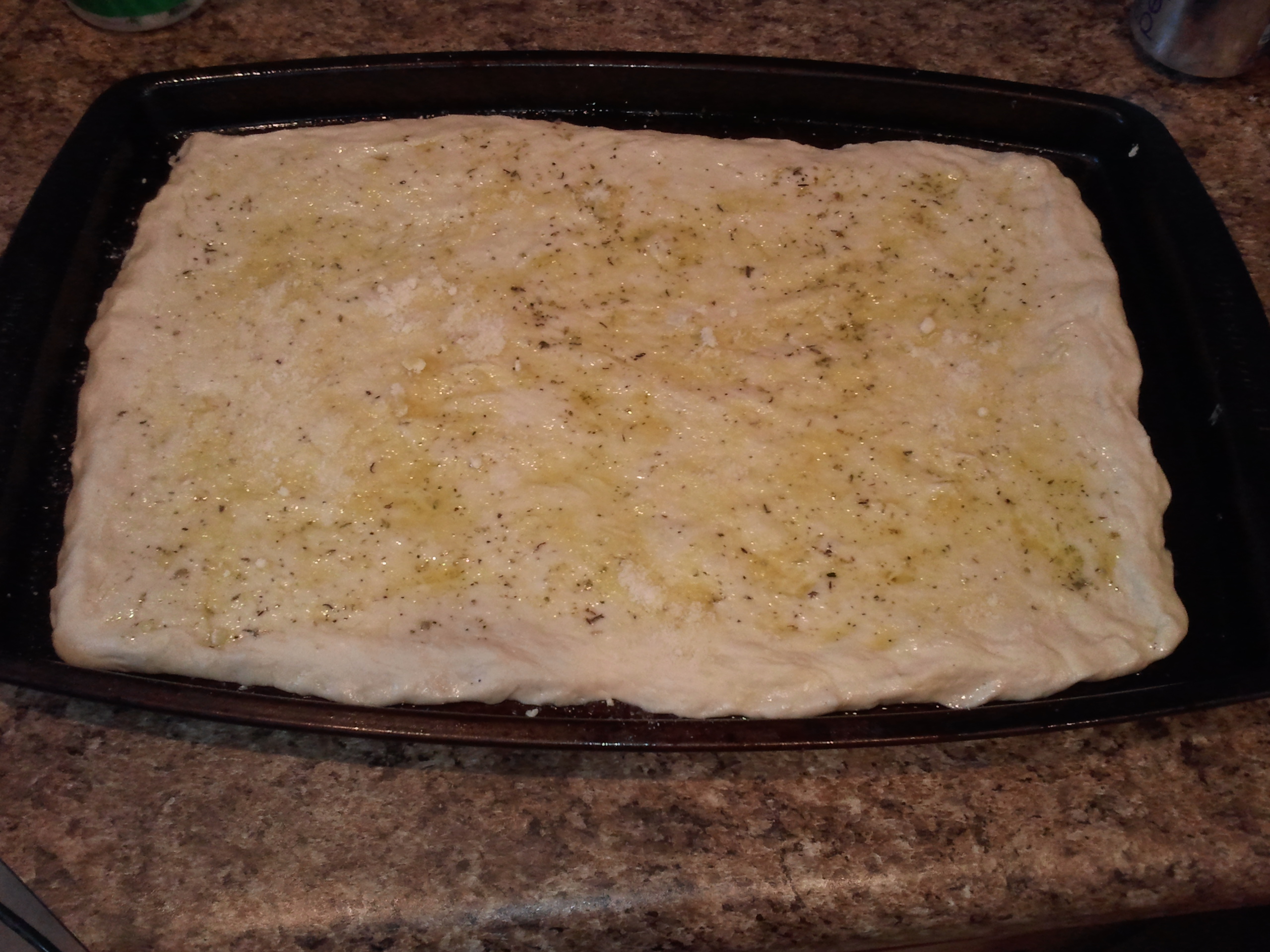 Spray a baking sheet with olive oil or cooking spray. Spread dough into a rectangle on baking sheet. Brush with olive oil, then sprinkle with Italian seasoning, Parmesan cheese, and mozzarella cheese, leaving an inch border around the outside.
