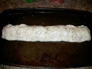 Then, roll up the dough lengthwise. Place seam side down on the baking sheet and seal the ends.