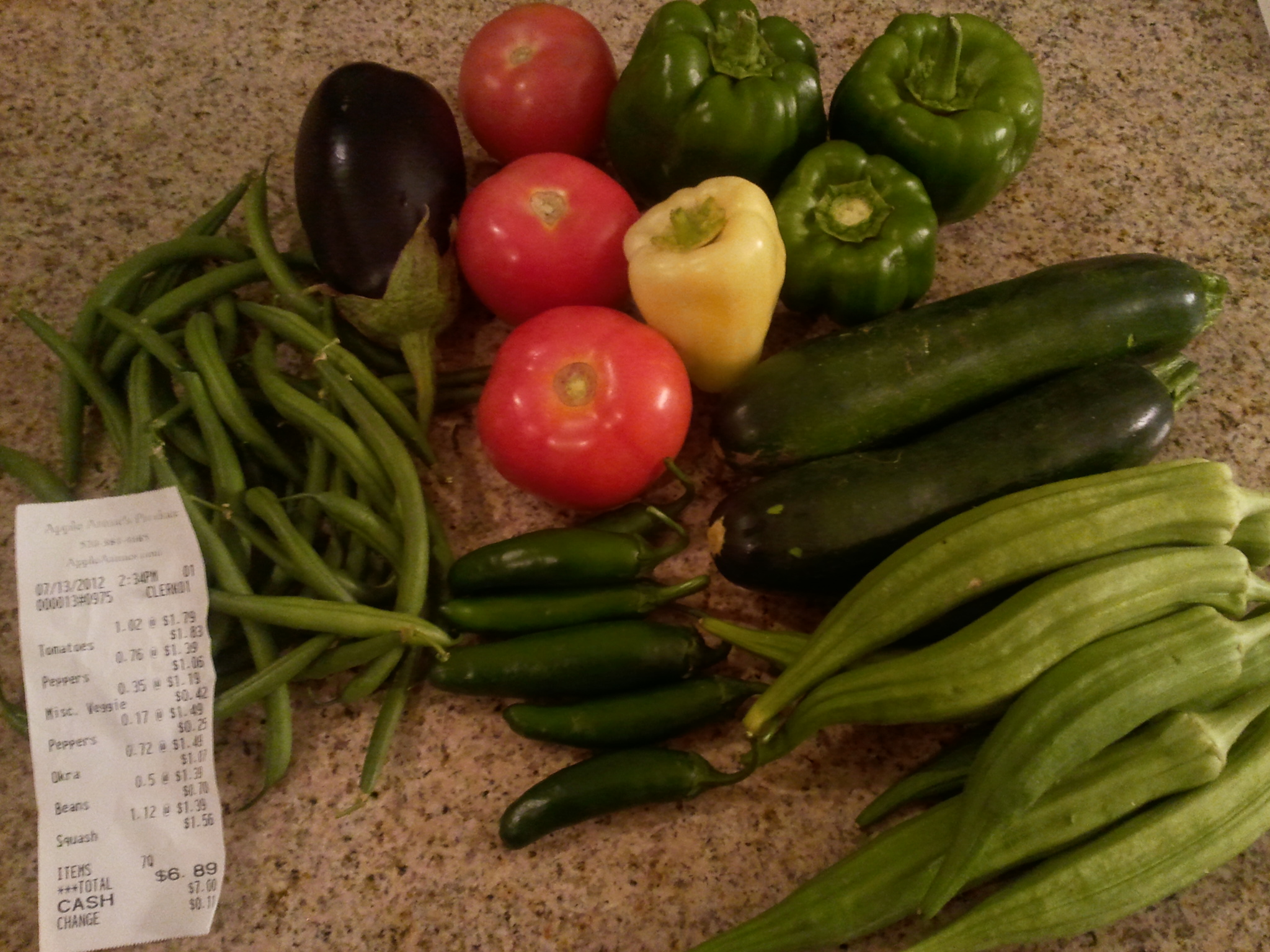 Green beans, eggplant, tomatoes, bell peppers, jalapenos, zucchini, and okra. All of this cost $6.89! I was pretty impressed with that price.