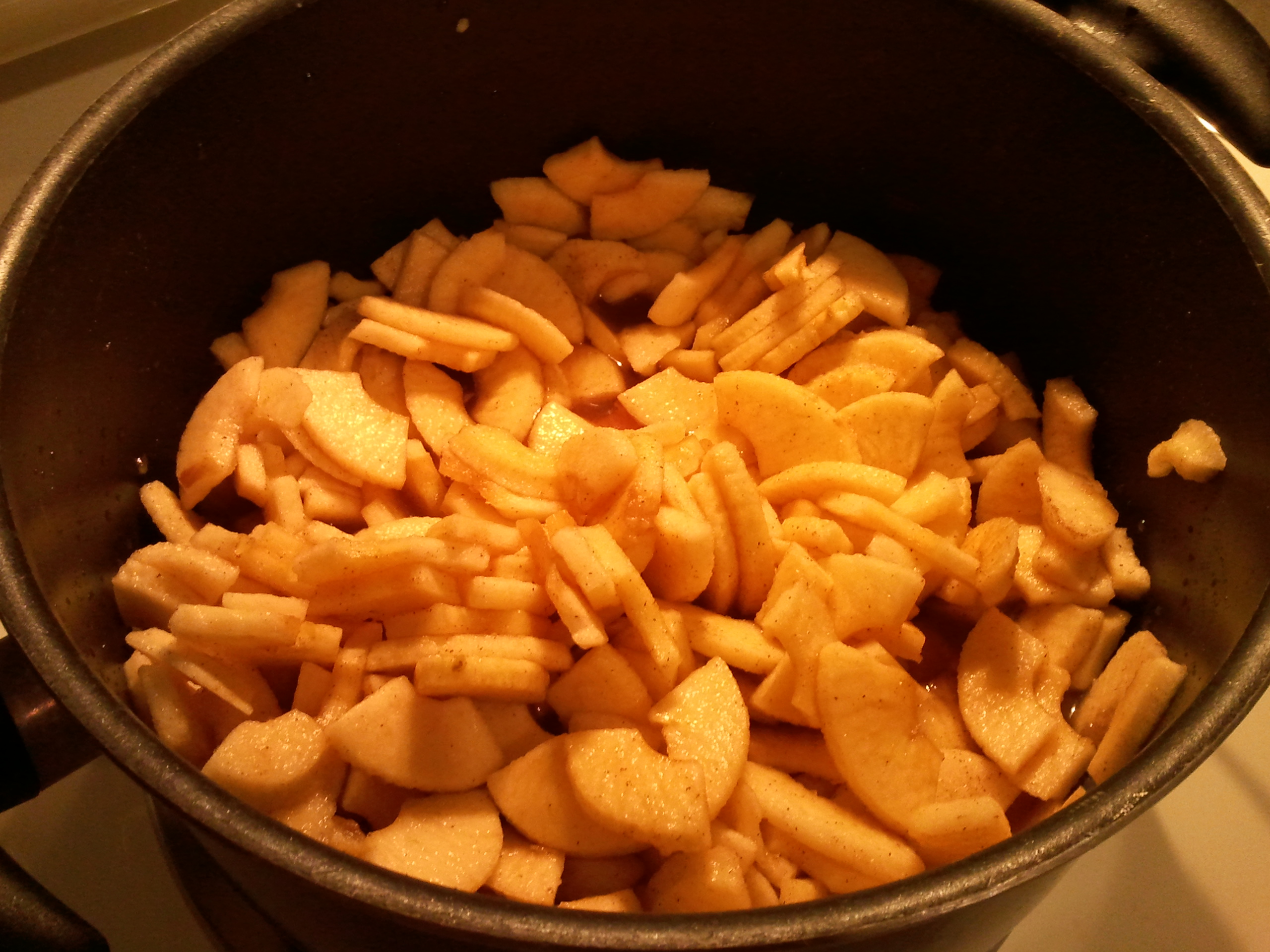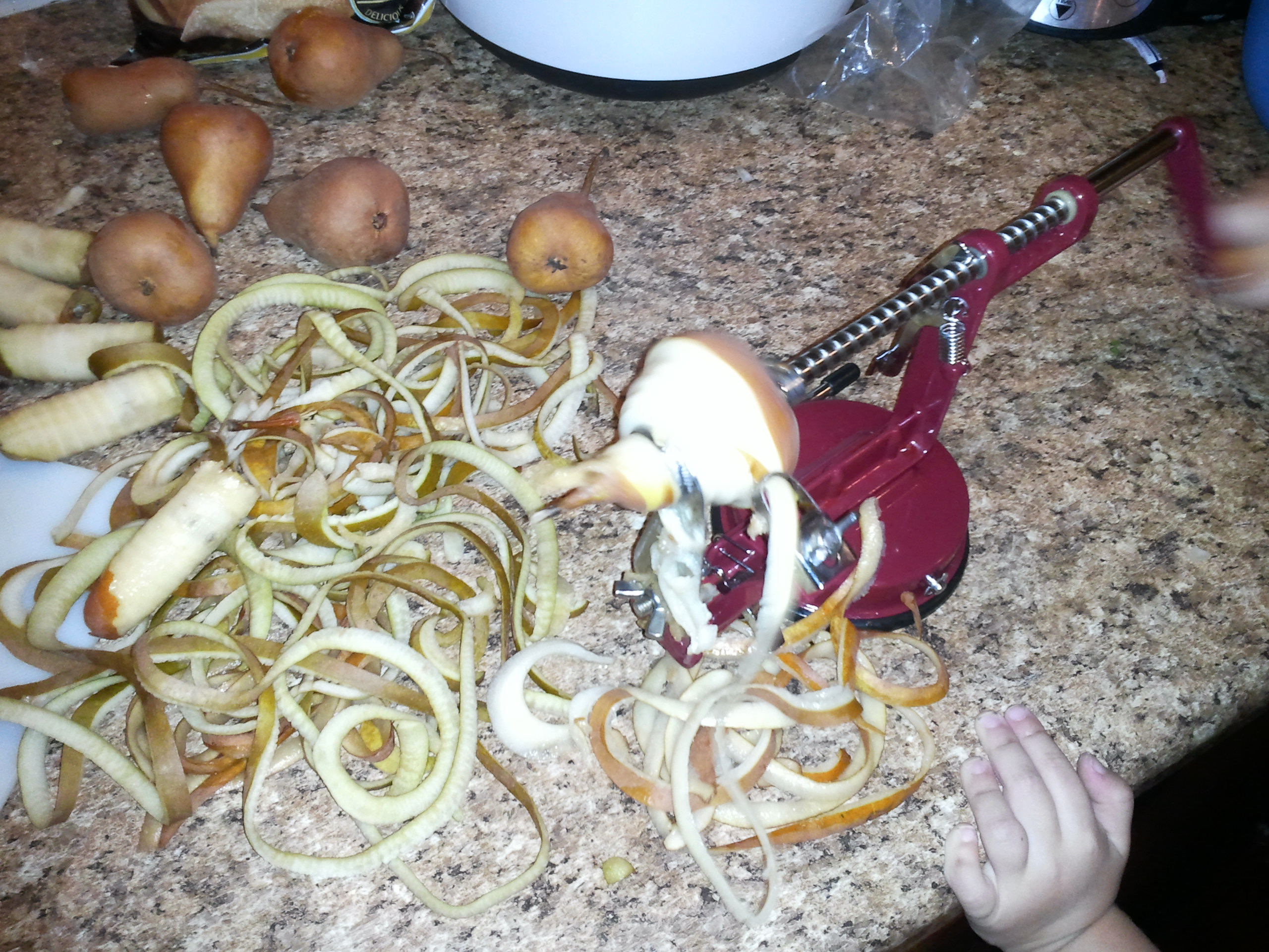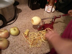 I used 6 1/2 pounds of the apples we picked, a mix of Granny Smith and Rome Beauty varieties, and used my peeler/corer/slicer to prepare all the apples, then used a hand chopper to chop them into smaller pieces. This filled up my 6 quart slow cooker pretty much to the top. Then, I added sugar and spices, skipping the salt and vanilla extract, according to this recipe for Slow Cooker Apple Butter: