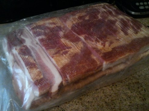 Today, was the pick up for the fresh premium hickory smoked bacon event.  And, just in time because I’m down to my last couple packages of bacon.  They made some changes from the last event, the bacon is fresh, but was delivered frozen.  Which is fine because it all went in the freezer anyway since I still have some from the last event to use.  It was also packaged differently.  Last time, it was in two 15 pound packages, and this time there were twelve 3 pound packages.  Their reason for this was to make it easier to share the case with friends and family.  I haven’t decided if I will re-package this or not.  I’m sure we could eat 3 pounds of bacon at once, but I don’t think we should!   Anyway, there were 36 pounds total, and it cost $125.64, or $3.49/lb.  I shared this case with a friend, and here is my share of the bacon: