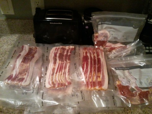 I counted out 16 slices of bacon, which was around 1 pound, some a little more, some a little less, but I figured that 16 slices is 4 pieces of bacon for each member of my family of 4.  For 12 sets, I vacuum sealed the bacon to put in the freezer.  The remaining 3 sets, I put in FoodSaver FreshSaver bags in the refrigerator.