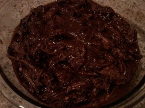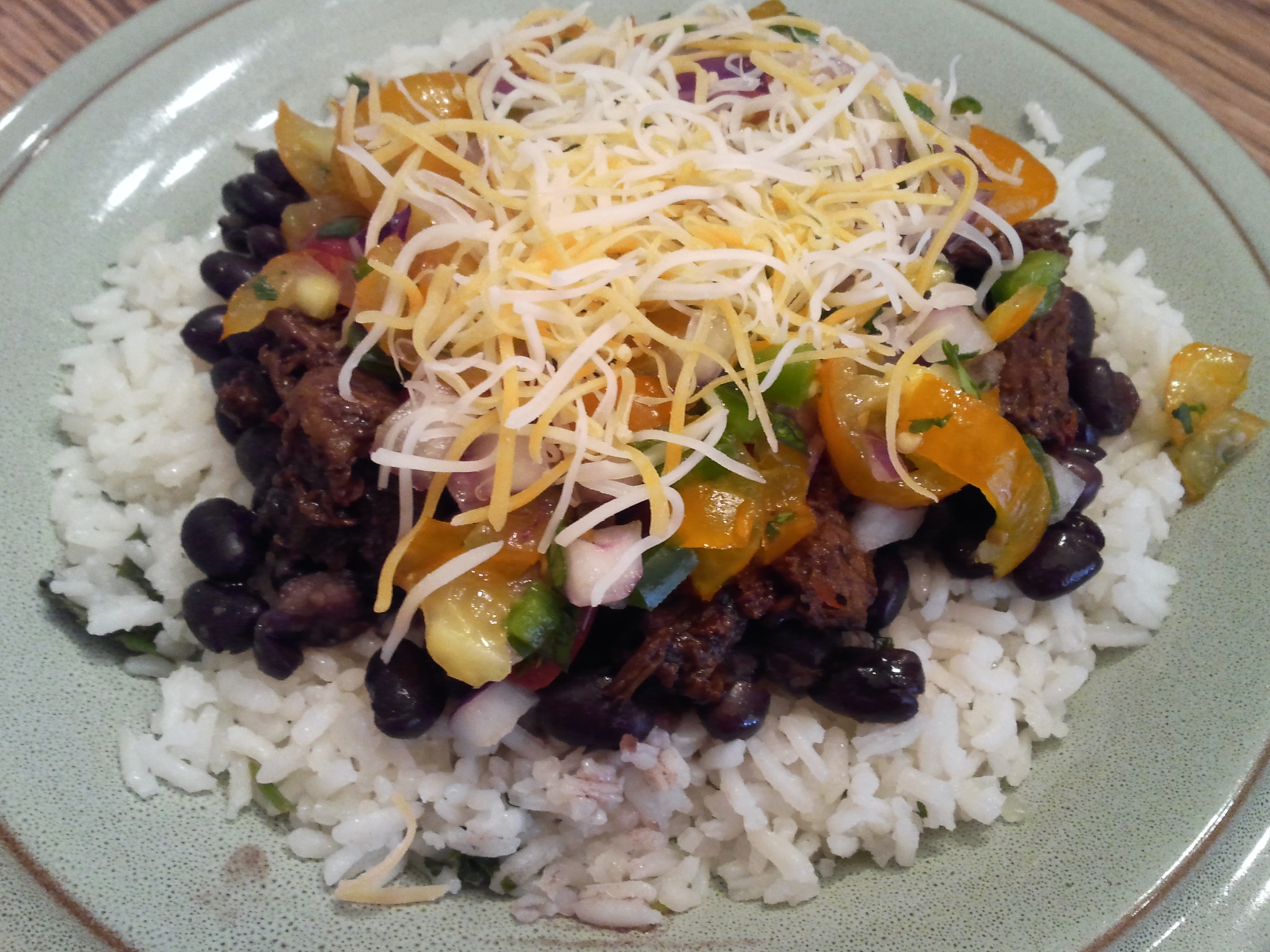 Chipotle has become one of my favorite places to eat at, but I am cheap and can’t eat out a whole lot. I recently found a great way to make Cilantro Lime Rice, but I wanted to see if I could find a way to make my favorite meat, barbacoa, as well. I still had the red chili peppers and chipotle peppers from a Bountiful Baskets fajita pack, and it turns out those were the right start to the barbacoa. I heated up a can of black beans, then made pico de gallo with jalapenos, red onion, yellow cherry tomatoes, cilantro, lime juice, and garlic salt. It turned out so good, it was one of the best meals I’ve had in a long time!