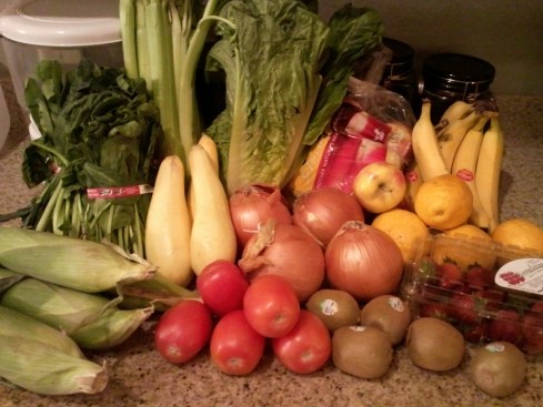Spinach, corn, celery, yellow squash, Romaine lettuce, yellow onion, Roma tomatoes, Ambrosia apples, bananas, lemons, strawberries (some are missing because my daughters got to them before I could!), and kiwi.