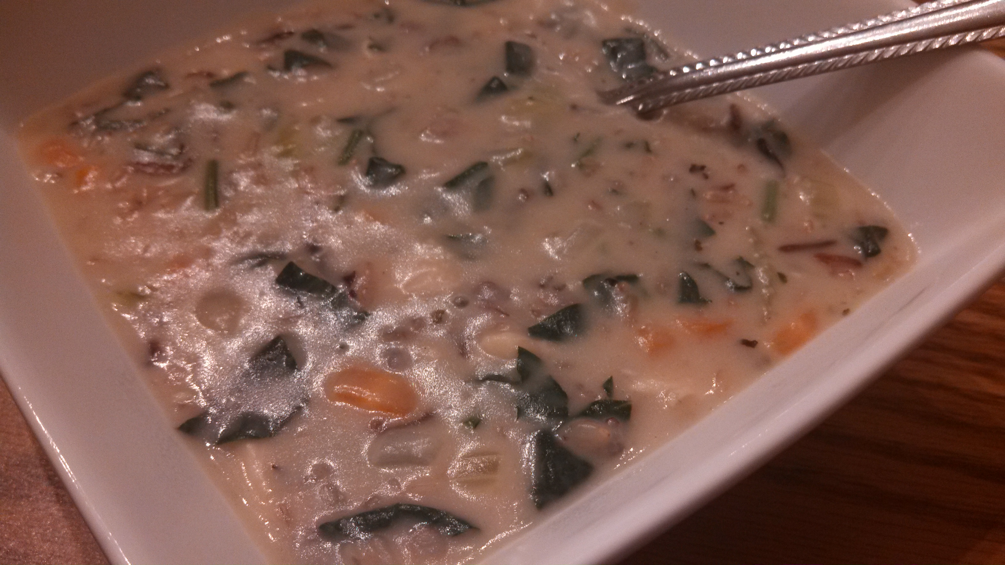 A few months back, my younger daughter insisted we get a soup cookbook at the grocery store checkout. I’m sure you’ve all seen them, and sometimes I will flip through one while we wait if something looks appealing. Well, for whatever reason, we HAD to get this one, and since cooking is something I enjoy with both my girls and want to teach them as much as I can, I agreed. It actually has a nice variety of soups, and this was one we’ve had marked for a while to try. Tonight we finally had a chance to try it, and it was perfect. It was actually pretty easy to put together, even with my changes, and the longest part was cooking the wild rice. It worked out nice that I could put the rice in my rice/vegetable steamer while we went to a swim lesson. Then, it was a matter of putting together the rest of the ingredients, which took about 30 minutes.