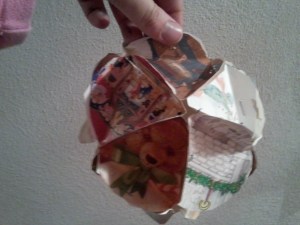 Looking for something to do with all those Christmas cards you got this year? This is a great way to re-use them, plus it’s an activity you can get your kids to help you with. I remember making these quite often as a kid, in all different sizes. Smaller ones you can hang on the tree, larger ones you can hang from a light, fireplace, entryway, or anywhere you want to decorate. I did these with my kids on New Year’s Eve and once we hung it, it reminded me of the ball that drops in New York each year. We used a can as our template for the circles, then I cut a triangle from a piece of cardboard. I did find a great template online for this activity that could be used as well. My 5-year-old helped with the cutting, and my 2-year-old helped a little too. We also assembled them using staples to save some time and mess, and both of them helped with the stapling.