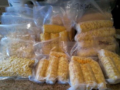 So, what did I do with 2 1/2 dozen ears of corn?  First, I removed all the husks and scrubbed the ears with a vegetable brush to remove any remaining silk.  Then, I blanched the corn.  If you aren’t familiar with blanching, this site explains why blanching is needed and what times you need for blanching.  For corn, you will want to boil it for 3-7 minutes, if you will be cutting the corn from the cob, 6-10 minutes if you will be freezing it still on the cob.  After the boiling, you put it in ice water to stop it from cooking any farther.  Once cool, you can cut the corn from the cob for packaging or package the whole cobs (or, in my case, I did some whole and some half cobs).