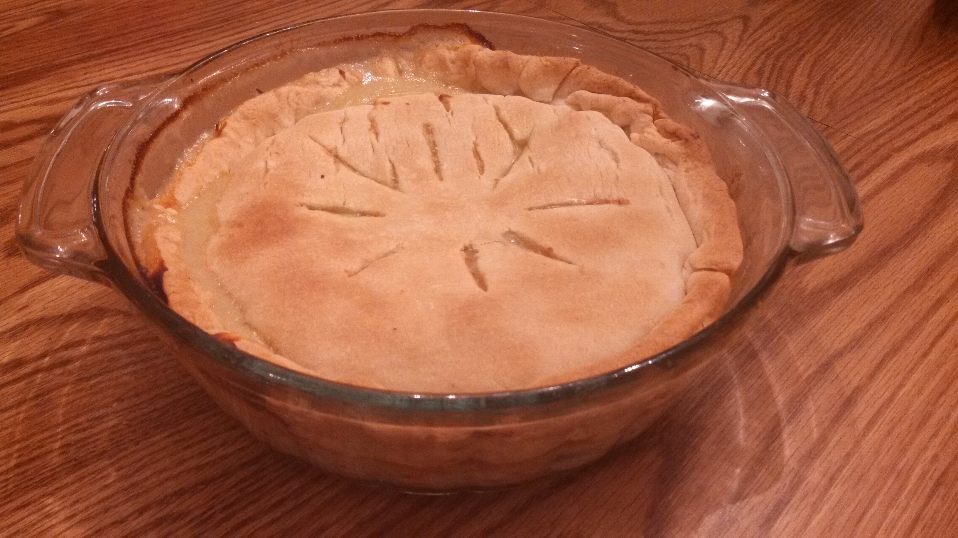 Pour mixture into a 2 quart round casserole dish.  Place the pie crust over the top of the mixture and press crust into the sides of the dish.  Cut vents in the crust.