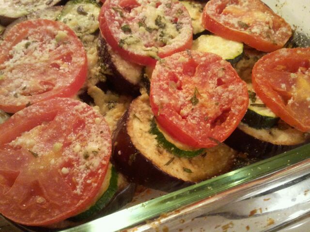 I’ve always wanted to try Eggplant Lasagna, but just hadn’t gotten to it. After we got eggplant at a recent Market on the Move event, I decided it was time to try it. Now, I have made Moussaka, so I know how to prepare the eggplant. Then, I decided to take my favorite Lasagna recipe from Daily Cynema, use the meat sauce and cheese filling, subbing the roast eggplant in place of the noodles. We did a row of 4 slices of eggplant for each layer. I didn’t get a real good picture showing how the eggplant looked, but you can almost see how in the 2 pictures here.