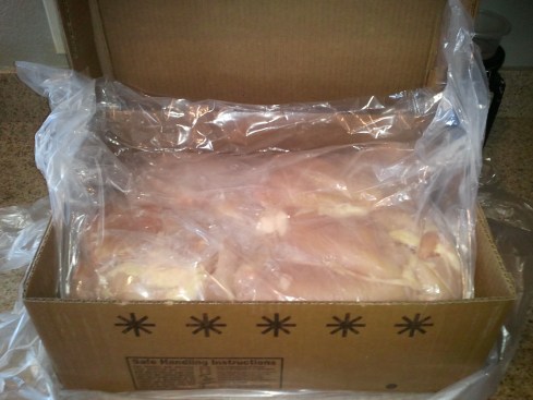 This week, Zaycon Foods had a boneless, skinless chicken breast event here in my town. Chicken is their trademark event, and I have seen pictures of others who have gotten it, and I decided I wanted to try it. This time, I didn’t share the case, I just bought one for me. It was a 40 pound unit, and the price this time was $1.89 per pound. Sometimes the grocery stores will have chicken as low as $1.67 per pound, but it’s not often and hard to get a good quantity since they usually have limits. I can’t get to the grocery store every day to get daily limit to stock up, so I was happy for this opportunity to stock up. So, what does a 40 pound box of boneless, skinless chicken look like? Like this: