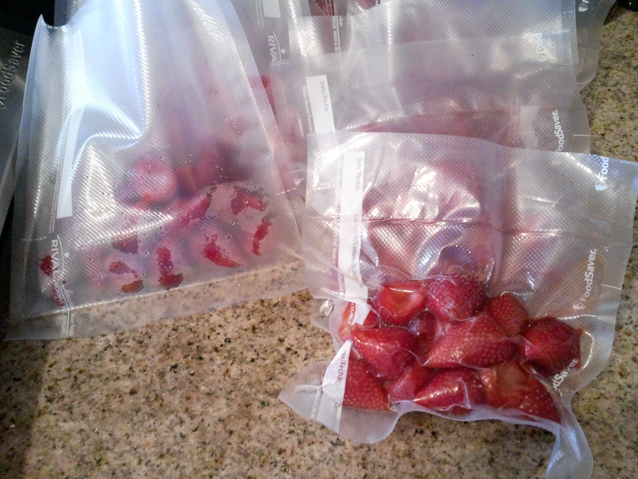 This was actually one of the largest ones, weighing about 2 pounds. I first cut it down the middle, then trimmed off the extra fat. I also trimmed some of the chicken from the undersides. Those pieces I cut in smaller pieces and collected in a measuring cup to get to 2 cups. The recipes I use that call for diced chicken or pre-cooked chicken typically are for 1 cups of chicken, and this ends up being about 1 pound worth of chicken. Once that was all done, I decided to put 1.5 to 2 pounds of whole chicken breasts into each bag. I used a roll on my FoodSaver to create my own size bags for this. I cut the larger size chicken breasts in half, so those bags had 4 chicken pieces, then the smaller ones I would put 3 pieces in a bag. It was a lot of work!