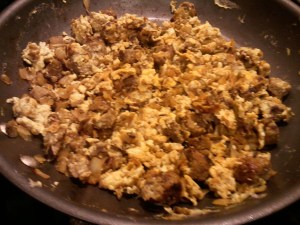 Cook onion and garlic together in remaining oil until onions are translucent.