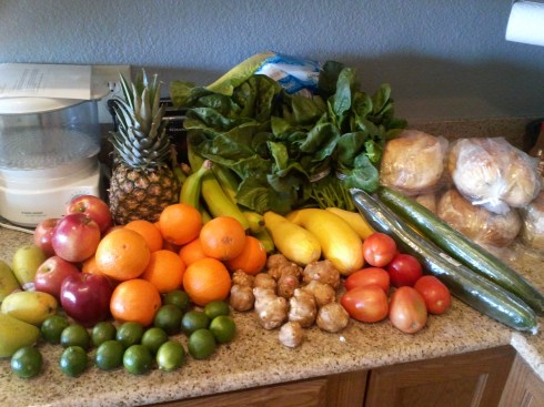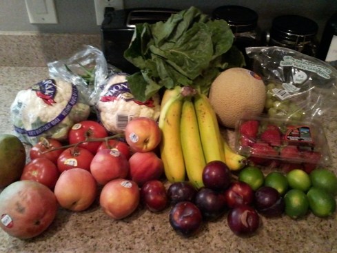This week, we got cauliflower, tomatoes, mangoes, peaches, lettuce, bananas, plums, cantaloupe, green grapes, strawberries, and limes. Plenty of fruit! I’m most excited about the cauliflower, I’ve learned many ways to cook cauliflower now that I’m excited to be able to use it again. I’ll probably end up at least making a pizza crust, probably roast some, then eat the rest raw. It’s my favorite veggie! With the limes, I want to make Fiesta Lime Chicken, which I haven’t had in a long time. I may also attempt a lime-ade of some kind, maybe strawberry lime-aid? We’ll see. The plums are amazing, and I may need to come up with a creative use for the peaches. Or, they may go in a smoothie with the mangoes and a banana.