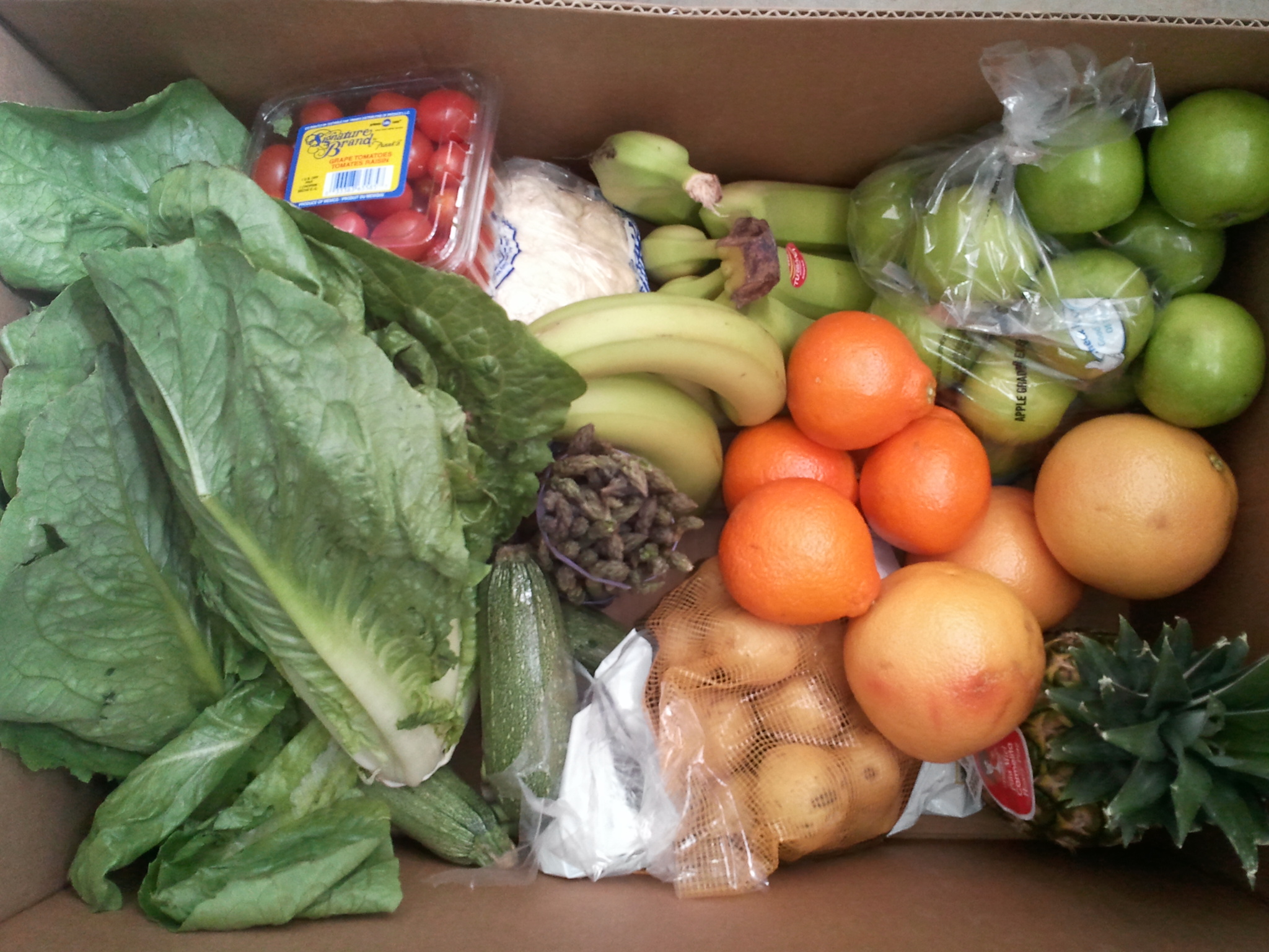 The giant head of cauliflower, baby bok choy, purple kale, donut peaches, and plums. The rest of the box, not pictured, included mangoes, cherries, sweet corn, broccoli, mushrooms, celery, and cantaloupe.