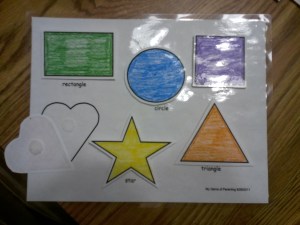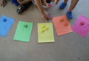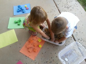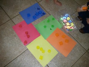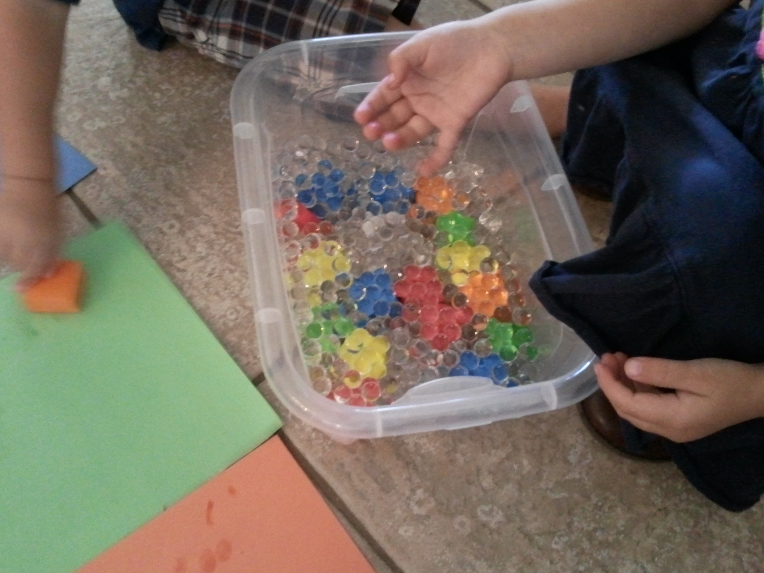 The first activity was on color recognition and matching, which was also a sensory activity. For this, I used 2 bags of colored foam shapes from Target dollar section, 2 containers of water bead decorative accents from the dollar store (found in the floral section), a plastic shoe box from the dollar store, and 5 pieces of construction paper. If you aren’t familiar with water beads, according to the container, they are a type of water absorbent polymer that absorbs, stores, and releases water. They are usually used in plant or floral arrangements. It also says they are non-toxic, but we kept a close eye on the kids while they played with these to make sure they didn’t put any in their mouths or left any out on the floor. I put the foam shapes in the plastic shoe box, then poured both containers of water beads in the box.