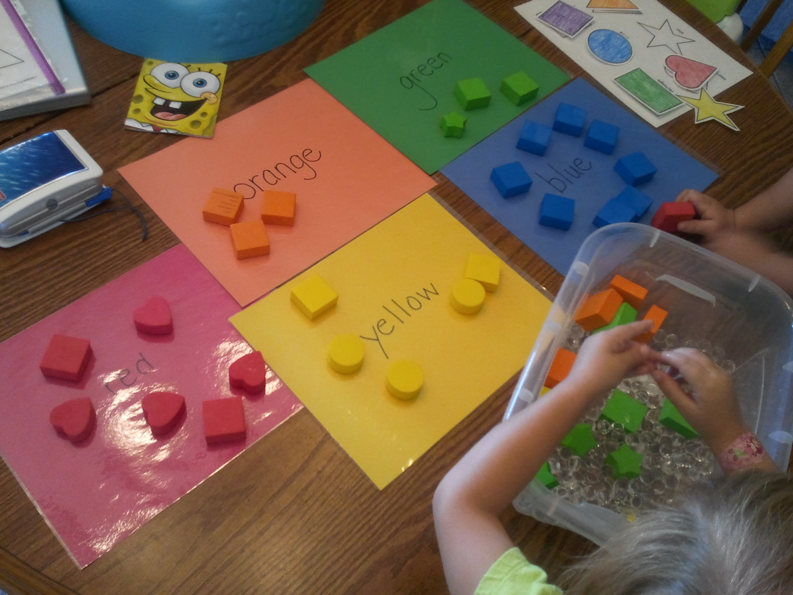 Then, I laid out construction paper in colors that corresponded with the colors of the foam shapes. The kids then had to dig through the water beads to get the shapes, identify the color, and match it to the paper of the same color.