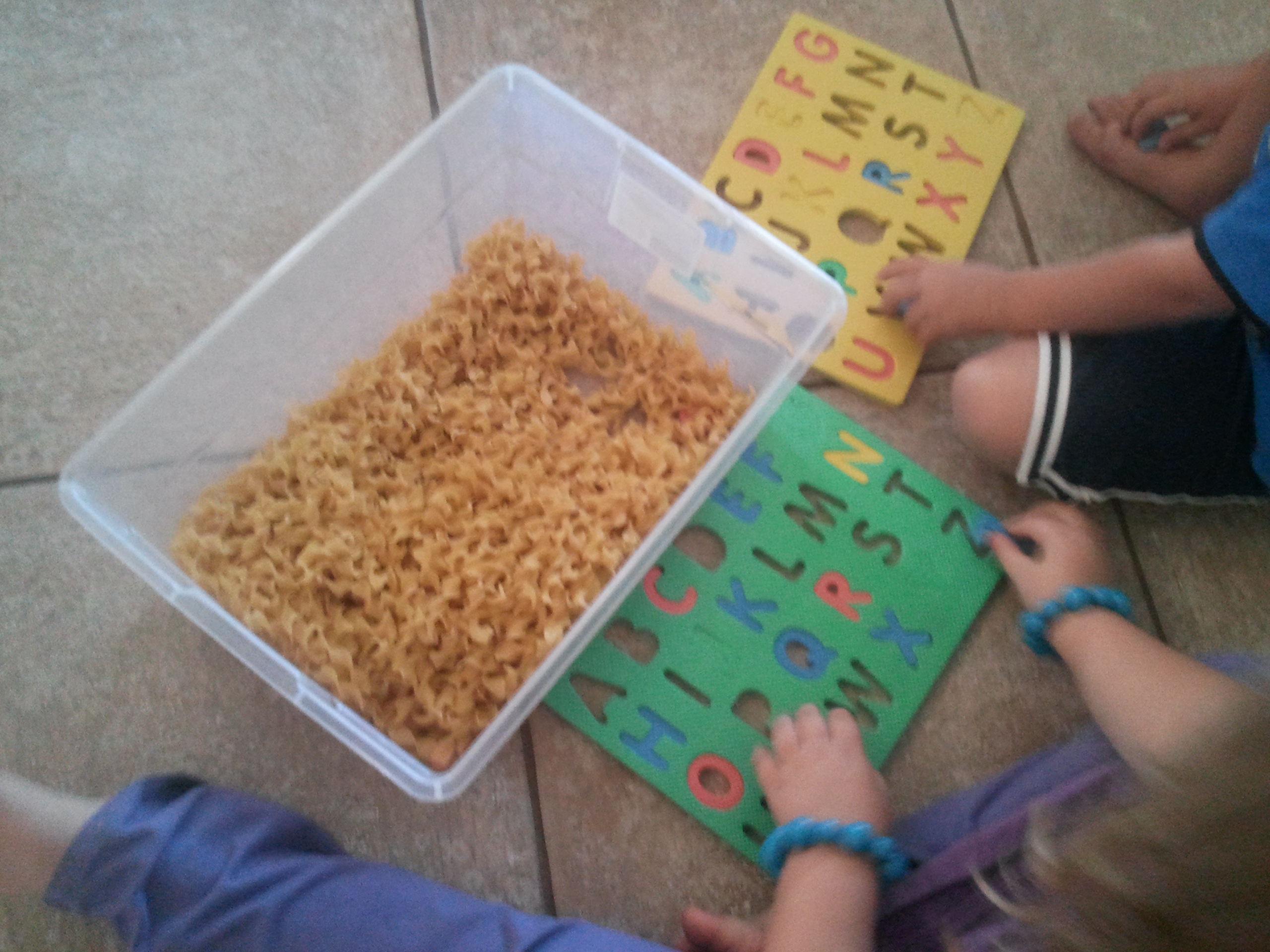 We took a little time out to play outside. Both kids were a little sleepy because they didn’t get much of a nap, so it was hard to get them to focus after playing outside, so the last activity we didn’t push too much. It was to learn about the letter A. I created a coloring sheet with an uppercase and lowercase A, along with pictures of things that start with the letter A. I also brought some items from around the house with the letter A.