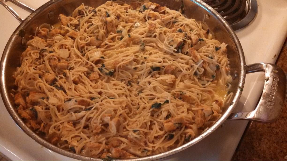 In the same skillet, put in the spinach and cook for a few minutes until spinach wilts. Place spinach on each of the chicken breasts in baking dish. Next, put shredded mozzarella on top of the spinach on each chicken breast.