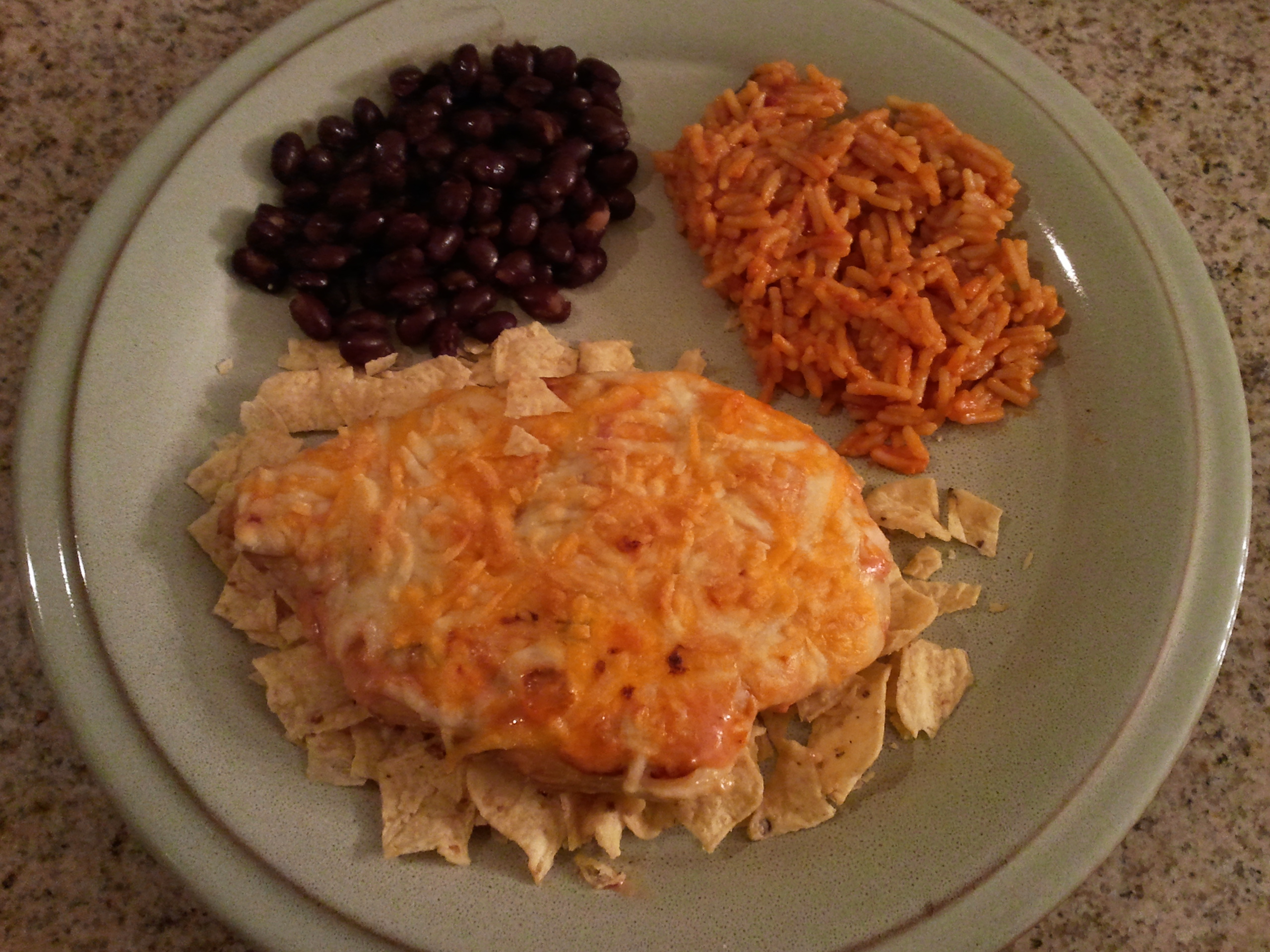 Fiesta Lime Chicken at Applebee’s is my favorite dish to order there.  A while back when I had gotten a bunch of limes from Bountiful Baskets, I decided I would look up how to make this dish online, and found this recipe.  It really tastes very similar, and with a few tweaks to that recipe, it’s fairly easy to make.   The original recipe uses tequila and liquid smoke, but I omit those 2 ingredients.  Tequila isn’t something I have on hand, and I’m not going to get it just for this recipe.  I grill the chicken, so the liquid smoke isn’t necessary.  If you broil the chicken, you may want to add the liquid smoke to get more of a grilled flavor.  Also, the original recipe makes the Mexi-Ranch sauce from scratch, but I cheat and just mix salsa and ranch dressing together to get the same result.  The first time I made this, I used fresh salsa that I had made, but this time used a jar of salsa from the store.  I did find the multi-colored tortilla strips at the grocery store, but I’m too cheap to buy a small bag of them for $2.99, so I just crumbled regular tortilla chips.  Not as pretty as the restaurant version, but tastes just the same!  Tonight, I served it with Spanish rice and black beans.  Some day I’ll get around to making Spanish rice instead of from a package.