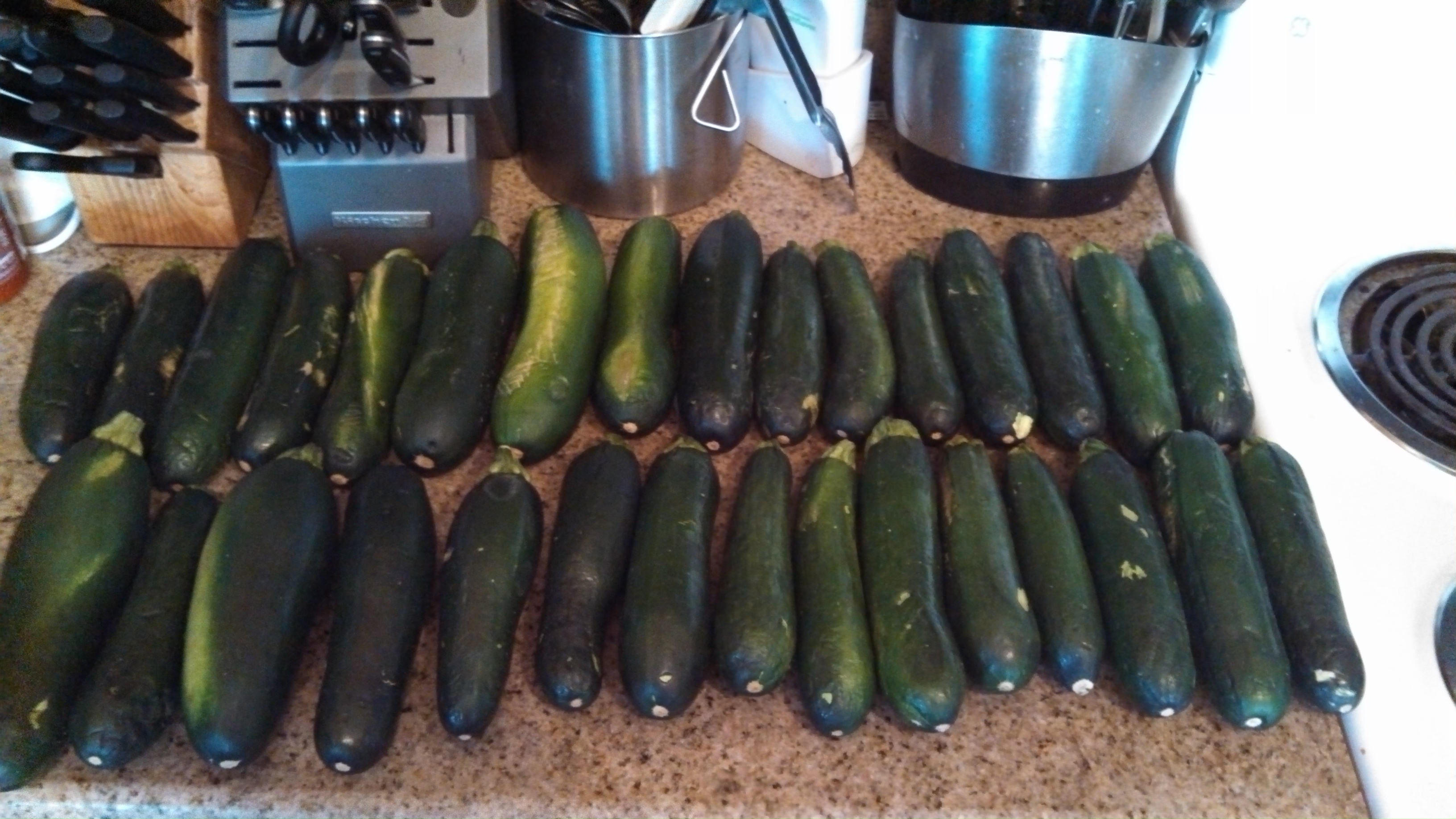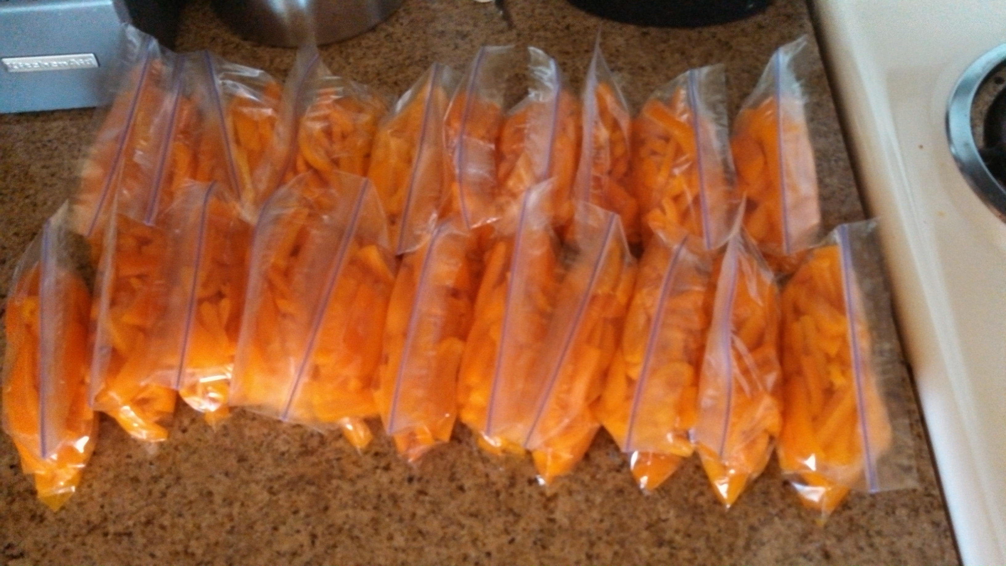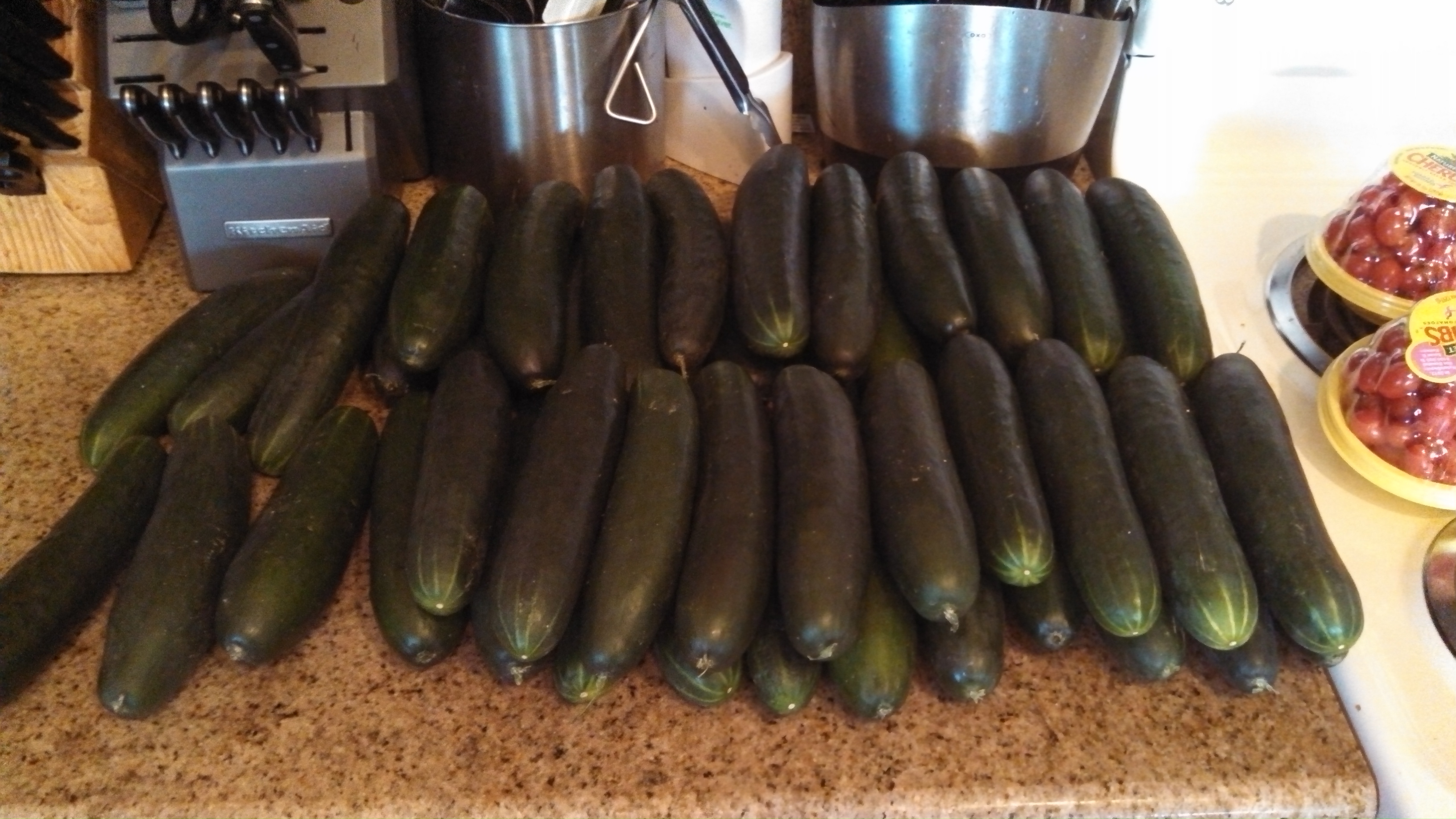 As you can see, the peppers are in snack sized bags for my husband to take to work for snacks. Half of the cucumbers I put in jars in the refrigerator to make pickles: