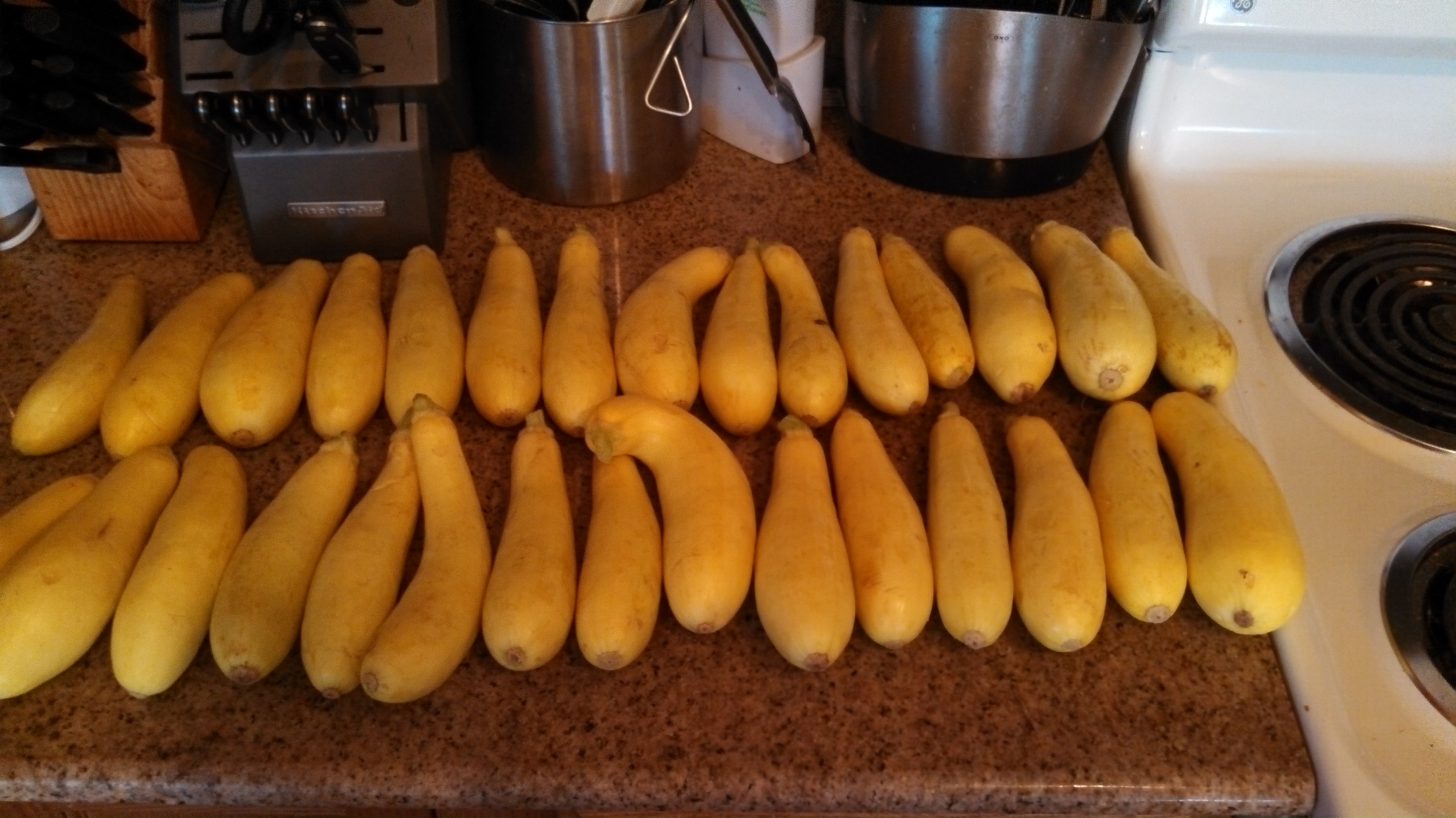 Not sure what I’ll do with the other half just yet, although some will be saved to juice with the watermelon to make Watermelon-Cucumber Coolers. For the zucchini and yellow squash, I will slice it, blanch, and freeze. Some will also be sliced, and I’m planning to use some of the Zaycon breakfast sausage that I just got, and make some Summer Squash, Sausage, and Egg Bakes to freeze and reheat for quick dinners later. The tomatoes I’ll wash and puree to put in jars in the fridge to make a couple batches of Spanish Rice this week. And then, I’ll take a long nap after all this work!
