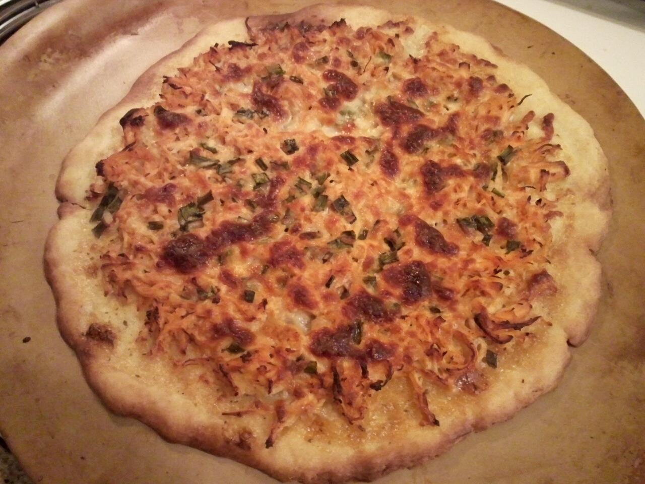 Spread ranch dressing on pizza crust. Next, spread chicken, then green onion tops, then cheese. Bake according to the directions for your pizza crust, in general, 425 F for 10-15 minutes, or until crust is golden brown and cheese is melted.