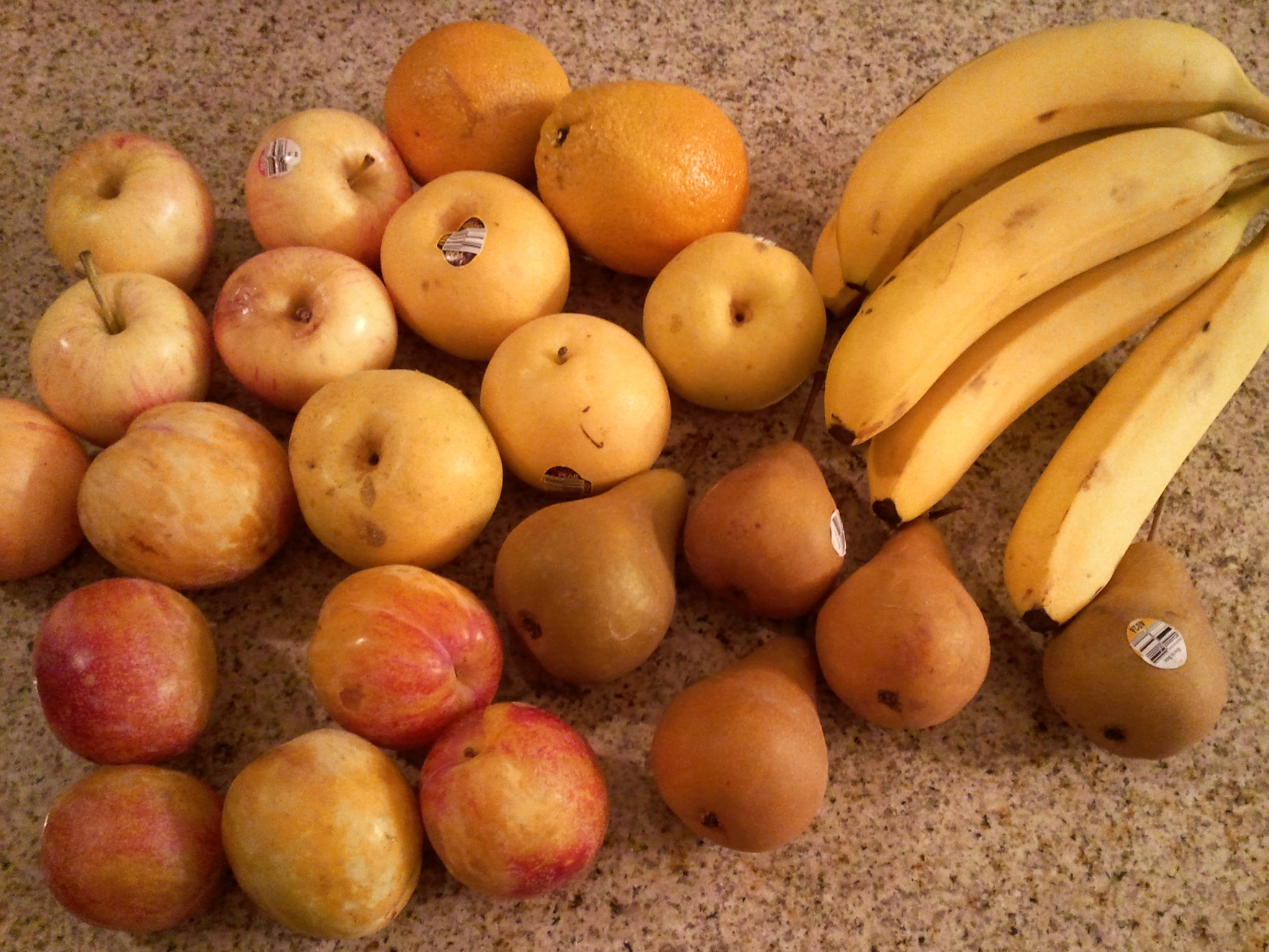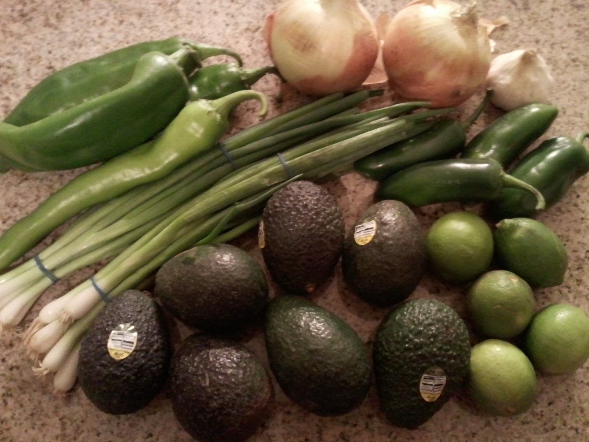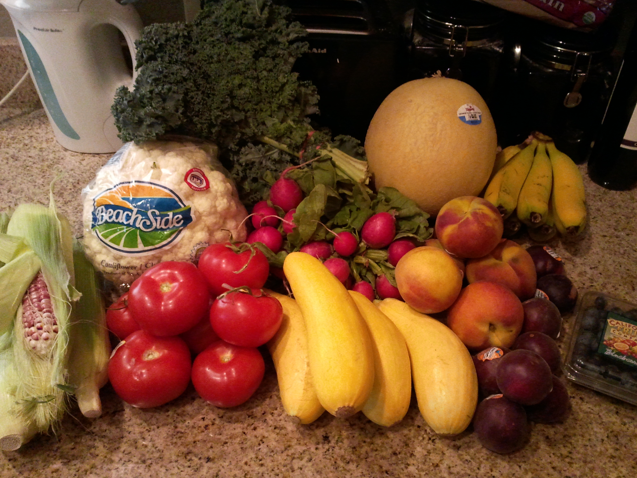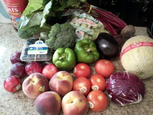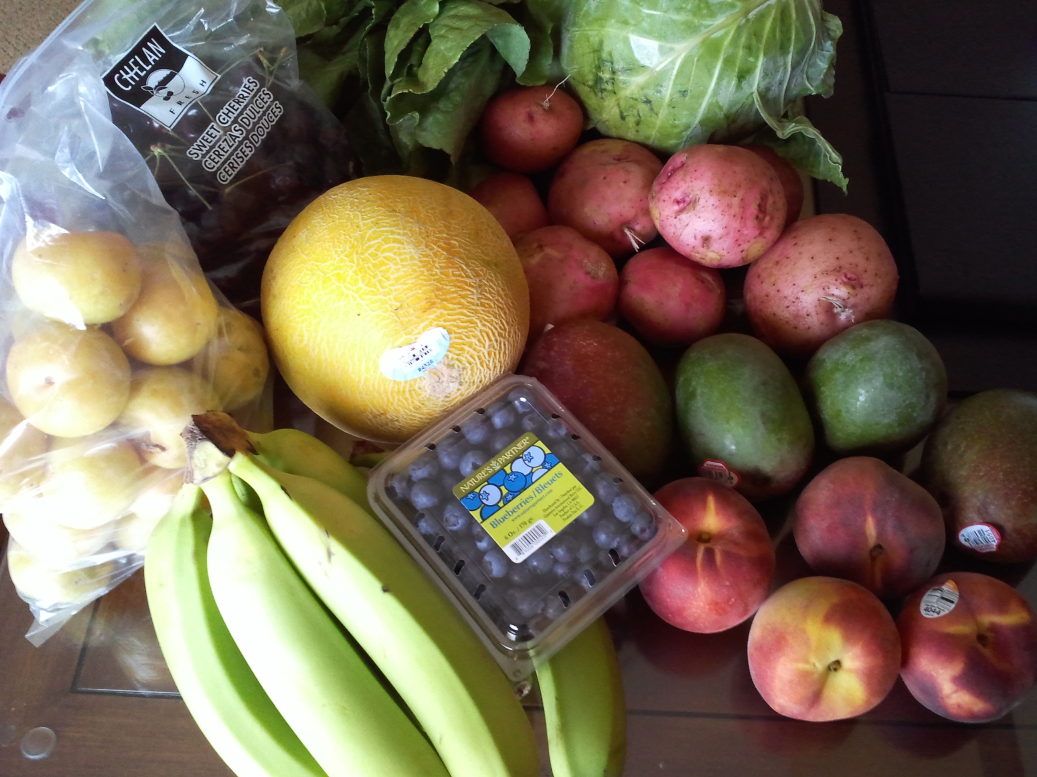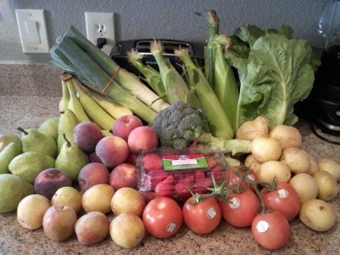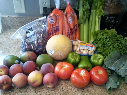Red potatoes, cucumbers, rainbow carrots, avocados, grape tomatoes, sweet peppers, strawberries, oranges, lemons, red delicious apples, golden delicious apples, and Asian apple pears. I’ve already used the lemons to marinate chicken and potatoes for mashed potatoes. We’ve been snacking on the peppers, cucumbers, carrots, and apples. I also made guacamole with the avocados.