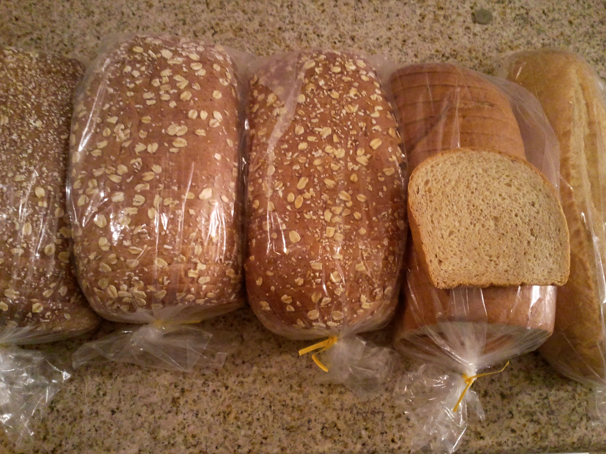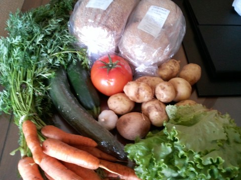 I picked a cucumber, micro cilantro, red potatoes #2 (non-perfect potatoes), raisin walnut bread, special spelt bread, radishes, green beans, and pink lady apples. All delicious! We really, really love the bread.