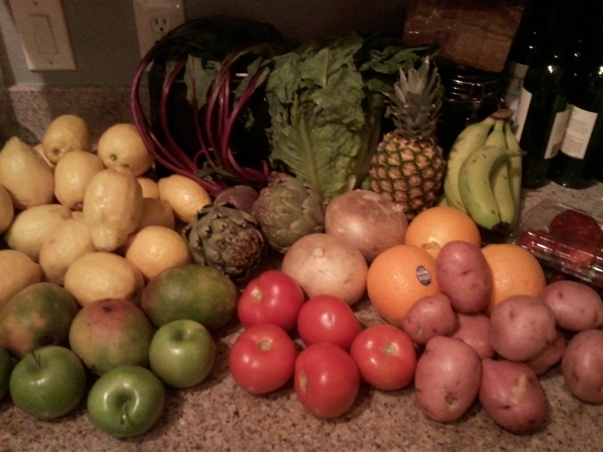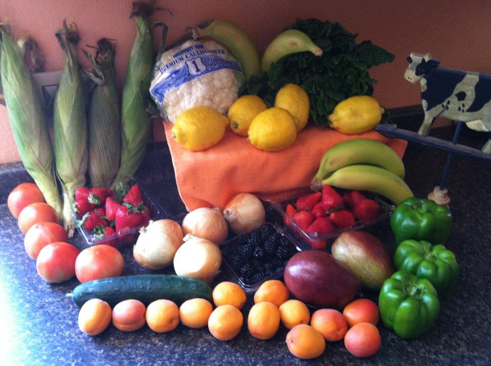 The giant head of cauliflower, baby bok choy, purple kale, donut peaches, and plums. The rest of the box, not pictured, included mangoes, cherries, sweet corn, broccoli, mushrooms, celery, and cantaloupe.