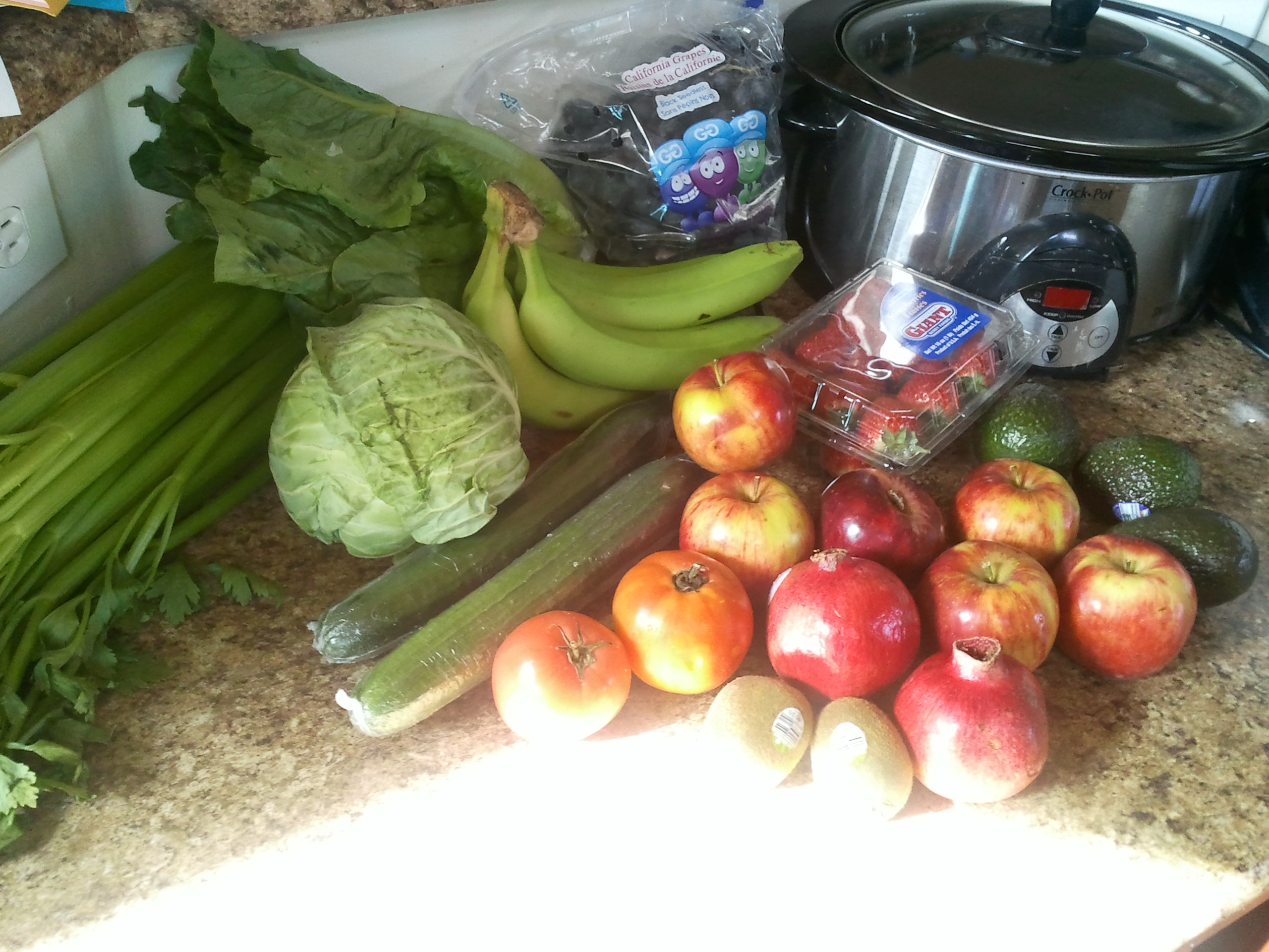 9 grain bread, pineapple, green grapes, bananas, nectarines, Gala apples, apple pears, black plums, iceberg lettuce, green peppers, red peppers, cucumbers, yellow onions, and Roma tomatoes